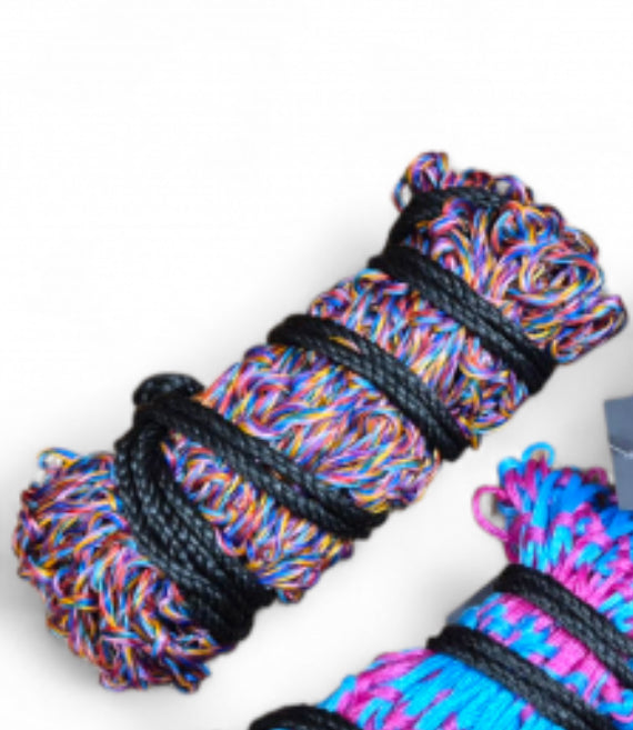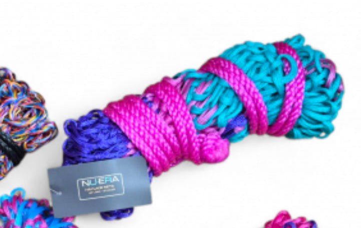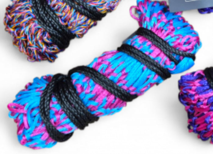 We have managed to get this compact wrapped which is a new method, when unravelled the compressed material springs out and is super stretchy. With thick tie cord this bright new product will fly off the shelves.